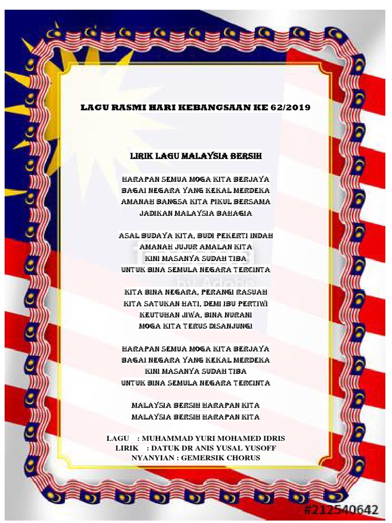 Lirik Lagu Malaysia Bersih Lagu Tema Hari Kebangsaan 2019. Yosheena Binti Miskam Created Date. Lirik dan lagu Malaysia Bersih lagu rasmi Hari Kebangsaan 2019 SayangiMalaysiaku MalaysiaBersih KemakmuranBersama KitaBersama.